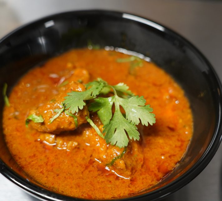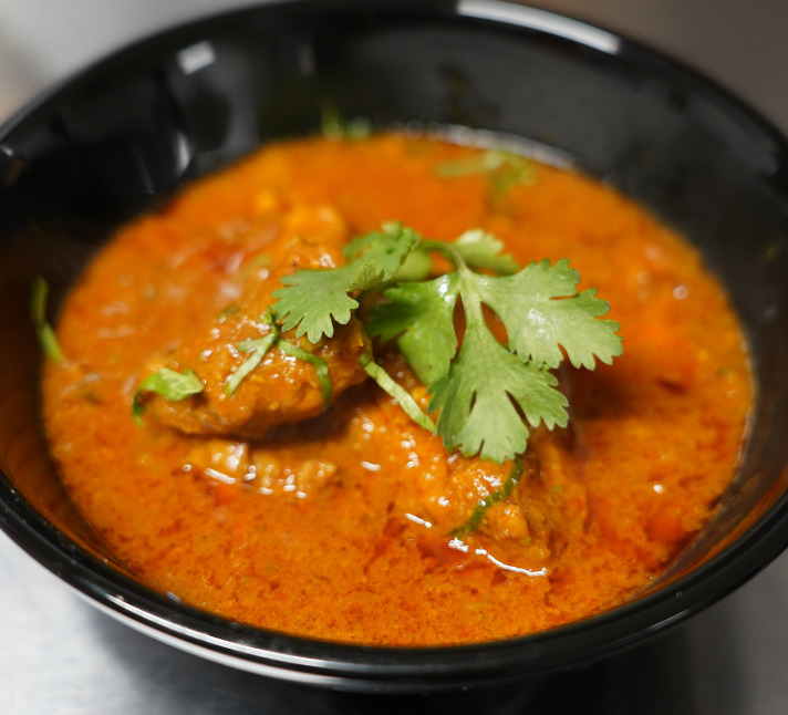 Slow-cooked bone-in goat in a traditional spiced curry, rich with deep, bold flavors and a rustic finish.
